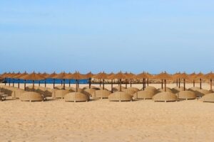 Přímo u hotelu se nachází krásná písčitá pláž s lehátky, slunečníky a osuškami zdarma. Moře má místy kamenné pláty, ale nabízí příjemné koupání. Celkově Melia Dunas Beach Resort poskytuje komplexní ubytování a zábavu pro hosty všech věkových kategorií.