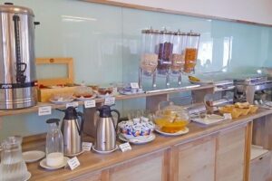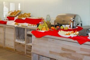 Hotel Sobrado má dvě restaurace, bar, fitness centrum a menší bazén s lehátky zdarma. Hosté mohou využít stravování formou plné penze plus, která zahrnuje snídaně, obědy a večeře formou bufetu. Během stravování jsou zahrnuty nealkoholické nápoje, pivo a víno. Plážový bar u hotelu Halos Casa nabízí nealkoholické nápoje a snacky zdarma během dne. Hosté mohou také využít á la carte restauraci za poplatek.